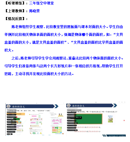 通过本周的听课活动,行政教师们进一步统一了思想,认清了当下疫情的形势,明确了接下来学习的方向。在听课的过程中,我们发现老师们虽在线上,但依旧朝气满满,各学科老师从教学常规入手,以高效课堂为切入点,科学处理教学内容,合理设计教学流程、精心选择教学方法、凝心聚力提升教育质量,为促进促进金小教育教学质量全面提升,贡献力量。