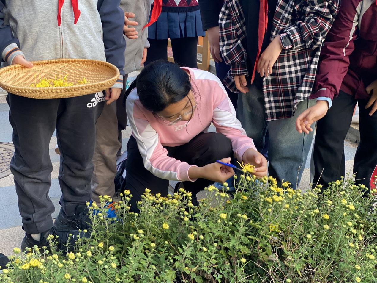 活动的第一部分,本草小研究员们在百草园里进行菊花采摘。在冯云老师的带领下,学生们仔细挑选了盛开的菊花,学习了如何挑选优质的花朵以确保茶叶的品质。菊花采摘不仅让学生们感受到了与大自然亲密接触的乐趣,也让他们对植物的生长与采摘有了更深的理解。